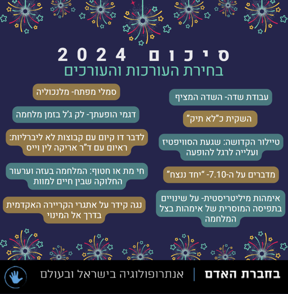 לכבוד סיום שנת 2024 אספנו את עשרת הכתבות הנצפות ביותר באתר (לפי גוגל אנליטק). לא תמיד הכמות קובעת, אבל אולי דווקא את הכתבה הו פספסתם בשנה הלא פשוטה הזו? . 1. "האם תאילנדים אוכלים כלבים? ולמה הישראלים חושבים כך" על מאמרו של ניר אביאלי (מעל 550 צפיות): 2.נגה קידר על אתגרי הקריירה האקדמית בדרך אל