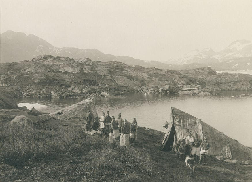 במחצית הראשונה של המאה העשרים תאר בשיטתיות החוקר הדני ויליאם תלביצר (William Thalbitzer), מחלוצי המחקר החברתי על תושבי גרינלנד, באמצעות מאות רישומים אתנוגרפיים, את התרבות האינואיטית באזורים שונים של האי. עבודותיו על פולחנים, פסטיבלים וטקסים, לצד מחקרו המקיף על אנשי Ammassalik במזרח גרינלנד, מספקים עד היום מסגרת היסטורית-תרבותית עשירה להבנת הממשק בין טקסיות, גוף, מוזיקה ותיפוף, נרטיבים מיתיים, כלכלה וארגון חברתי מקומי בגרינלנד (Thalbitzer 1924; 1941). בפתיחה לאחד מספריו, קובץ תרגומים ועיבודים לשירה גרינלנדית מסורתית משנת 1920, תלביצר תיאר את דמותה של "טרולית ההרים", שהתאבנה למרגלות הר Anjeen במחוז Ammassalik. לפי תיאורו, הייתה זו אישה שילדה בסתר והפכה לאבן באותו מקום; בראשית המאה העשרים, הוא מספר, עדיין ניתן היה לראות את דמותה עומדת כשפניה מעוותות בכאב, ונוסעים שעברו באזור נהגו להניח שומן לווייתן בזווית פיה באצבעותיהם כדי להבטיח מזג אוויר טוב במסעם.