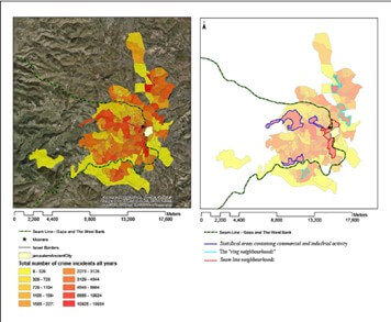מירחבנו את הנתונים באמצעות תכנת מיפוי גיאוגרפי GIS וגילינו דפוס מעניין: מצאנו ריכוזי אירועים לאורך קוו הגבול ההיסטורי של ירושלים: גם בליבה של העיר, גם בשכונות הטבעת וגם לאורך רחוב יפו. קוו הגבול שימש כקוו גבול בינאומי אשר הוסר אחרי מלחמת 1967, אך עד היום ממשיך להיות קוו גבול ברור מן הבחינה המעמדית והאתנו-לאומית. המימצא חזר על עצמו גם לאחר נירמול הנתונים. המסע המחקרי שלי התחיל משילוב בין אירועי טרור לאירועי פשע. התוצאה היתה מרתקת עוד יותר: מרחבית, הם התנהגו אותו דבר: זאת אומרת אירועי פשע וטרור מתקיימים באותם מקומות. כתבתי על כך במאמר. השופטים של המאמר חשבו שלא ניתן לחבר טרור ופשע. ודחו את המאמר. הבנתי שעוד לא בשלה העת לקבלת מחקר אינטרדיספלינארי המשלב את שני העולמות הללו. פרמתי. הפרדתי את הפשע מהטרור. נשארתי בפשע.