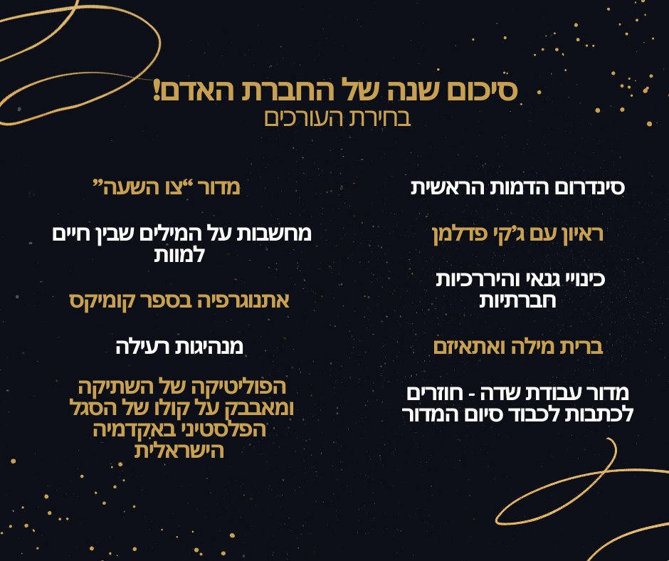הימים האחרונים של השנה הם זמן בו רבים עוצרים להתבונן אחורה, על מה שהיה. בבחברת האדם, אנחנו חוזרים אל הטקסטים האהובים עלינו, שהשאירו אותנו עם מחשבות וליוו בשנה החולפת. אנחנו שמחים להציג לפניכם את בחירות העורכות והעורכים לשנת 2025! מוזמנים להיכנס לקרוא, ולהנות גם משאר הטקסטים המצוינים שהתפרסמו אצלנו ולא נכנסו מפאת המקום.